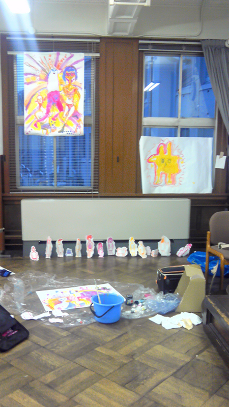 作品たちはアクティビティーというか元気がいっぱいで、制作風景を公開しながらの展示という自由なオモシロい形式でした。